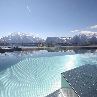 Lernen Sie die private Atmosphäre und die Ruhe eines eigenen Schwimmbades kennen und geniessen Sie bei jedem Blick über den Beckenrand die atemberaubende Aussicht über den Thunersee und in das Bergpanorama des Berner Oberlands.