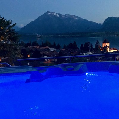 Even in the warm pool you don't have to give up on the view to the alpine panorama and over the Lake Thun. Enjoy it. It will be unforgettable..